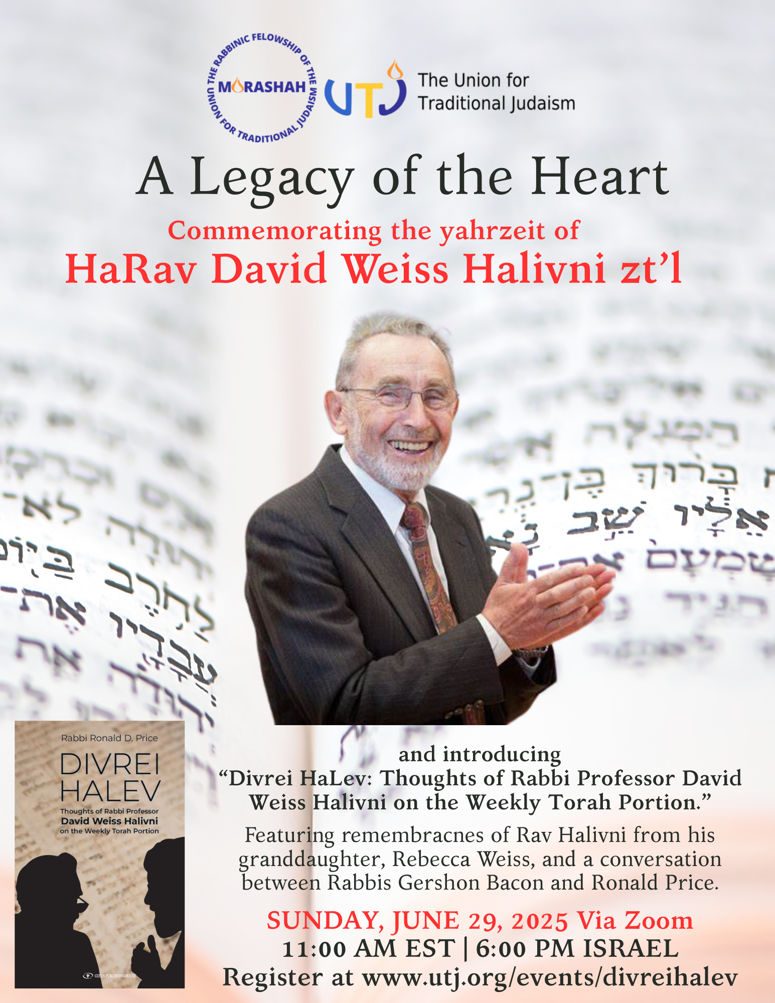 Please note: Sponsors of this webinar donating $180 or more may choose to receive a free copy of Divrei Halev, by Rabbi Ronald Price featuring thoughts on the weekly parashah inspired by Rabbi David Halivni Z”L. Limit one per person.