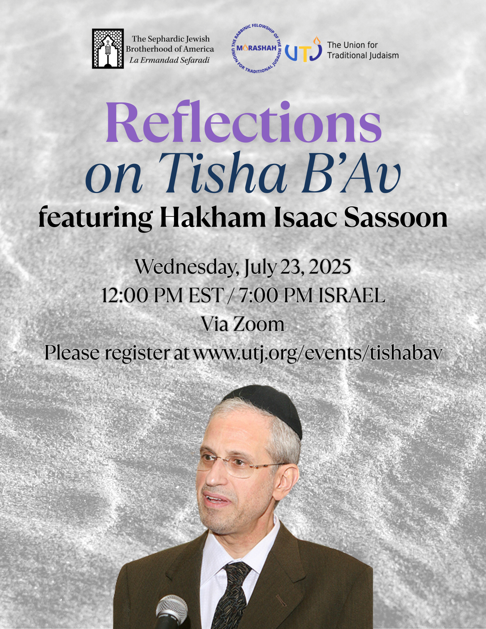 UTJ announces an upcoming webinar co-sponsored with the Sephardic Jewish Brotherhood of America: Reflections on Tisha B’Av with Hakham Isaac Sassoon on Wednesday, July 23 at 12:00PM Eastern / 700 PM Israel time. You can also purchase Divrei Halav from Amazon here. Please note that UTJ is a participant in the Amazon Services LLC Associates Program, Continue Reading »