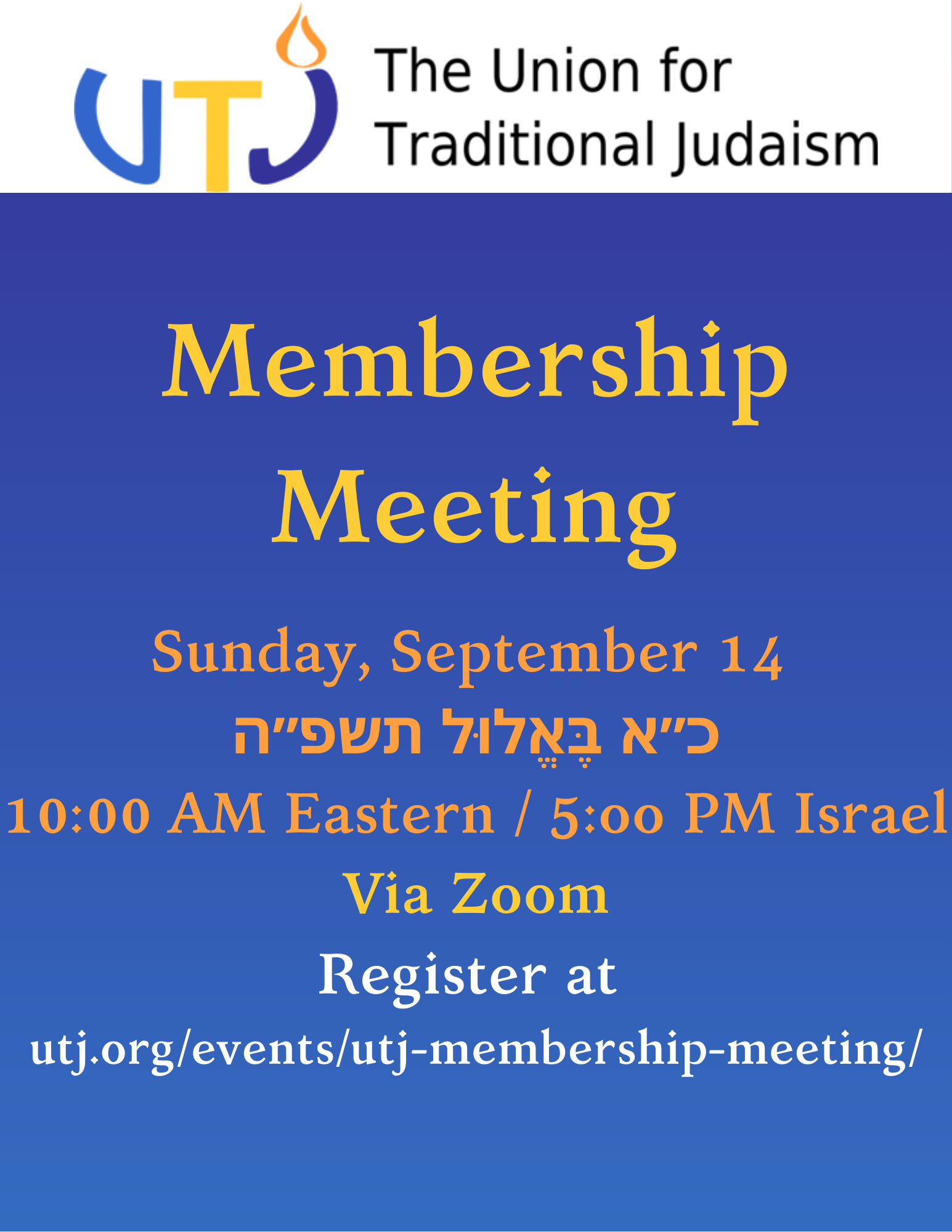 Dear UTJ Members and Supporters: We are at a very exciting moment in UTJ’s history as we work to solidify our recent growth by implementing a new system of UTJ leadership and governance. As such, we are pleased to invite you to Join UTJ for 5786 and to participate in our Membership meeting on Sunday, Continue Reading »